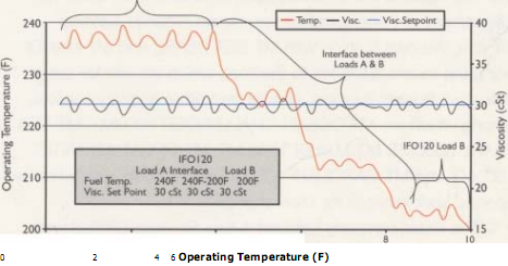理解為什么混合物粘度有所不同負(fù)荷負(fù)荷只有一塊拼圖。結(jié)果如何理解不同的粘度是另一回事。不同等級的船用重油當(dāng)形式層儲存在相同的儲油罐。作為一個結(jié)果,以維持粘度設(shè)置點、燃油的燃燒控制系統(tǒng)必須應(yīng)對急劇變化時對燃油粘度變化之間的接口的掩體滿足燃油駁運泵抽吸。(見圖查看插入的一個例子IF0120不同負(fù)荷)。圖說明了一個相當(dāng)大的變化IF0120粘度的層之間所負(fù)荷圖作為°和°B。這需要改變粘度降低燃料溫度從240°F到200°F為了保持粘度設(shè)置點上30 cst。認(rèn)為會發(fā)生什么事假如操作者僅靠一個理論溫度設(shè)置點來自典型的燃料燃燒曲線。小費會犯規(guī)燃燒器更加頻繁的排放會受到不良影響。