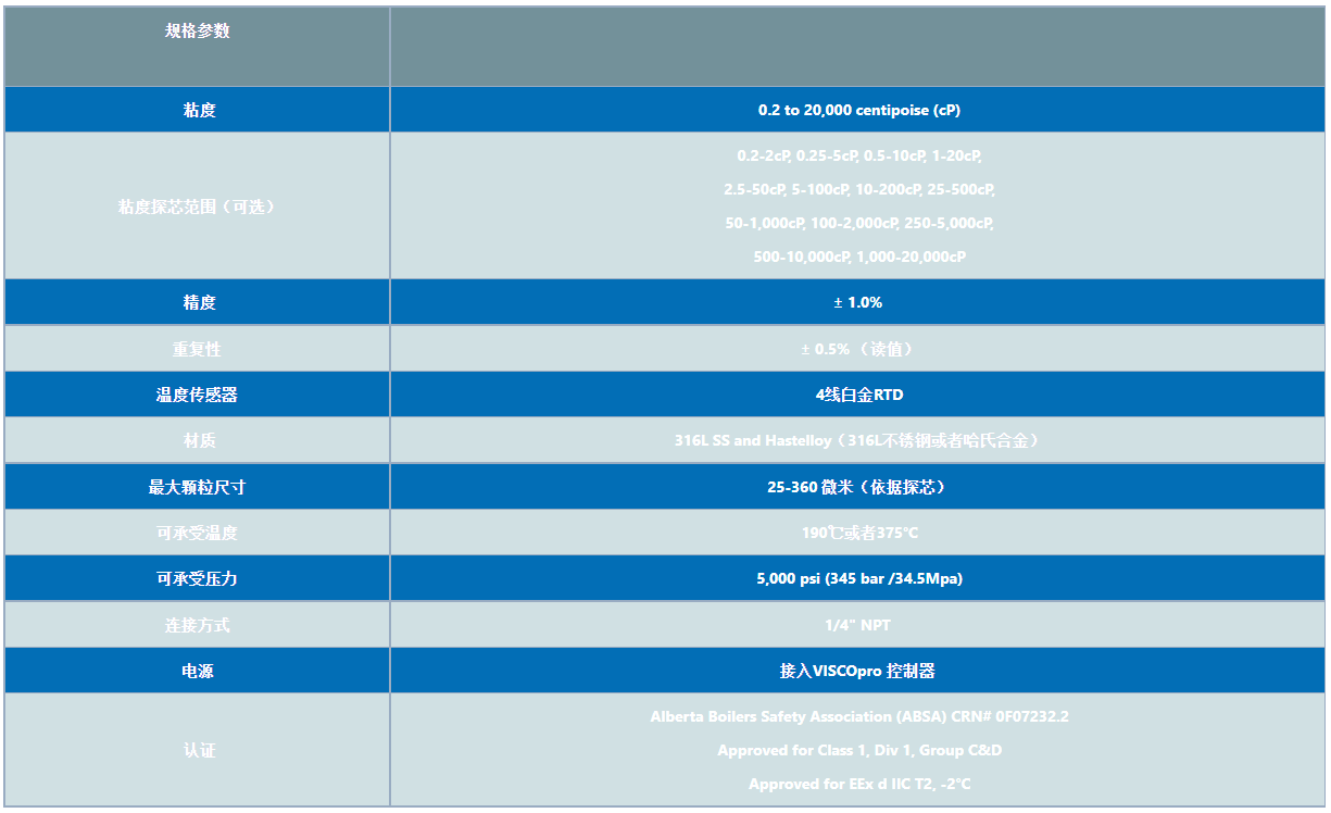 能夠在0.2-20000CP或等量CST的粘度范圍內(nèi),進(jìn)行13種不同粘度范圍的測量。 探頭頭部的最大流速為10英尺/秒(3米/秒)。